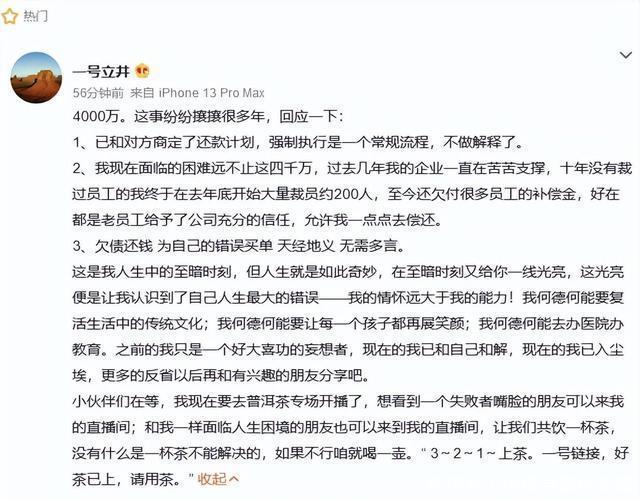 李亚鹏的债务问题早已是公开的秘密。2023年4月,李亚鹏因被执行4000万元的消息登上热搜。 当时他本人曾发文回应,表示已和对方商定了还款计划,并坦言:“现在面临的困难远不止这四千万,去年底开始大量裁员约200人,至今还欠付很多员工的补偿金。” 面对巨额债务,李亚鹏近年来积极尝试各种方式赚钱还债,其中包括投身直播带货行业。