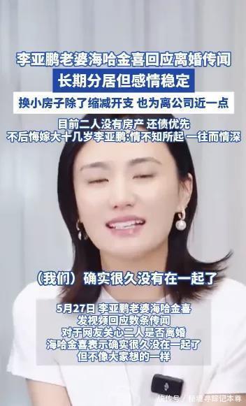 这段年龄差距巨大的恋情当时就引发广泛关注。 两年后,2022年3月,李亚鹏与海哈金喜宣布结婚,同年他们的女儿出生。这段婚姻在当时看来是李亚鹏继与天后王菲婚姻后的感情新起点。 然而,这段关系在今年初就显现出一些端倪。5月27日,海哈金喜曾发布视频专门回应离婚传闻,当时她坚决否认了离婚传言。 “她和李亚鹏没有离婚,两个人正在一起努力还债。”海哈金喜在当时的视频中这样澄清。