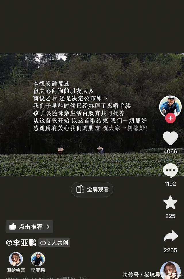 “本想安静度过,但关心问询的朋友太多,商议之后,还是决定公布。”李亚鹏在视频中这样解释公开离婚消息的原因。这段始于2020年的恋情,历经结婚生女,最终在2025年画上句号。 01离婚消息公开 一石激起千层浪。10月14日,李亚鹏通过视频账号“一号立井”发布声明,正式宣布与海哈金喜离婚。 视频中,李亚鹏语气平静地表示:“我们于早些时候已经办理了离婚手续,孩子跟随母亲生活由双方共同抚养。” 这则消息迅速登上热搜,引发网友热议。 李亚鹏在视频中用“从这首歌开始,以这首歌结束”来形容他们的关系,似乎暗示着他们的感情故事有着颇具仪式感的开端与结局。 面对这段感情的终结,李亚鹏展现出一种淡然态度,在视频结尾表示:“我们一切都好!感谢所有关心我们的朋友,祝大家一切都好!” 02三年感情历程 李亚鹏与海哈金喜的感情之路可谓快节奏。2020年,当时49岁的李亚鹏公开与比自己小19岁的女友海哈金喜的恋情。